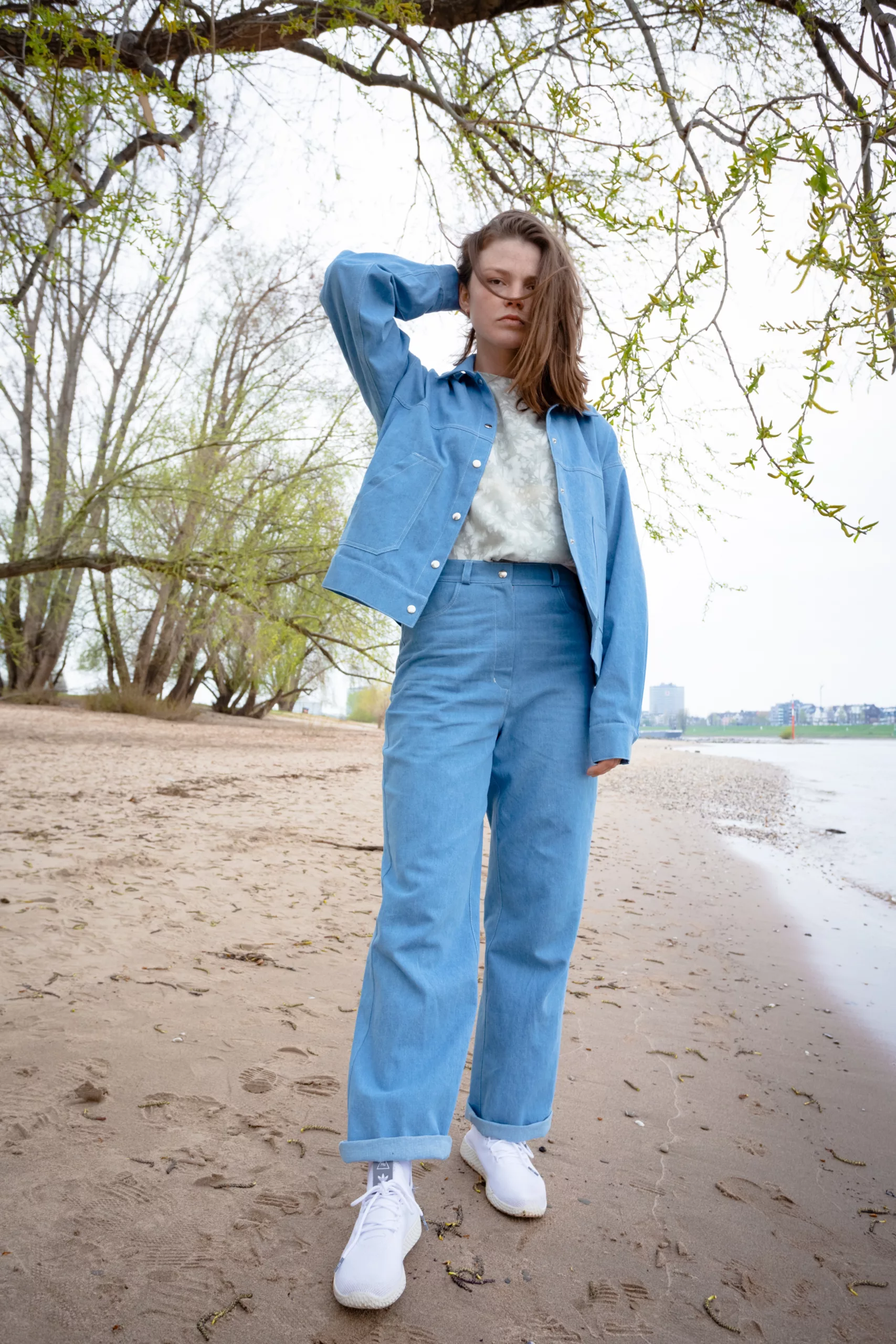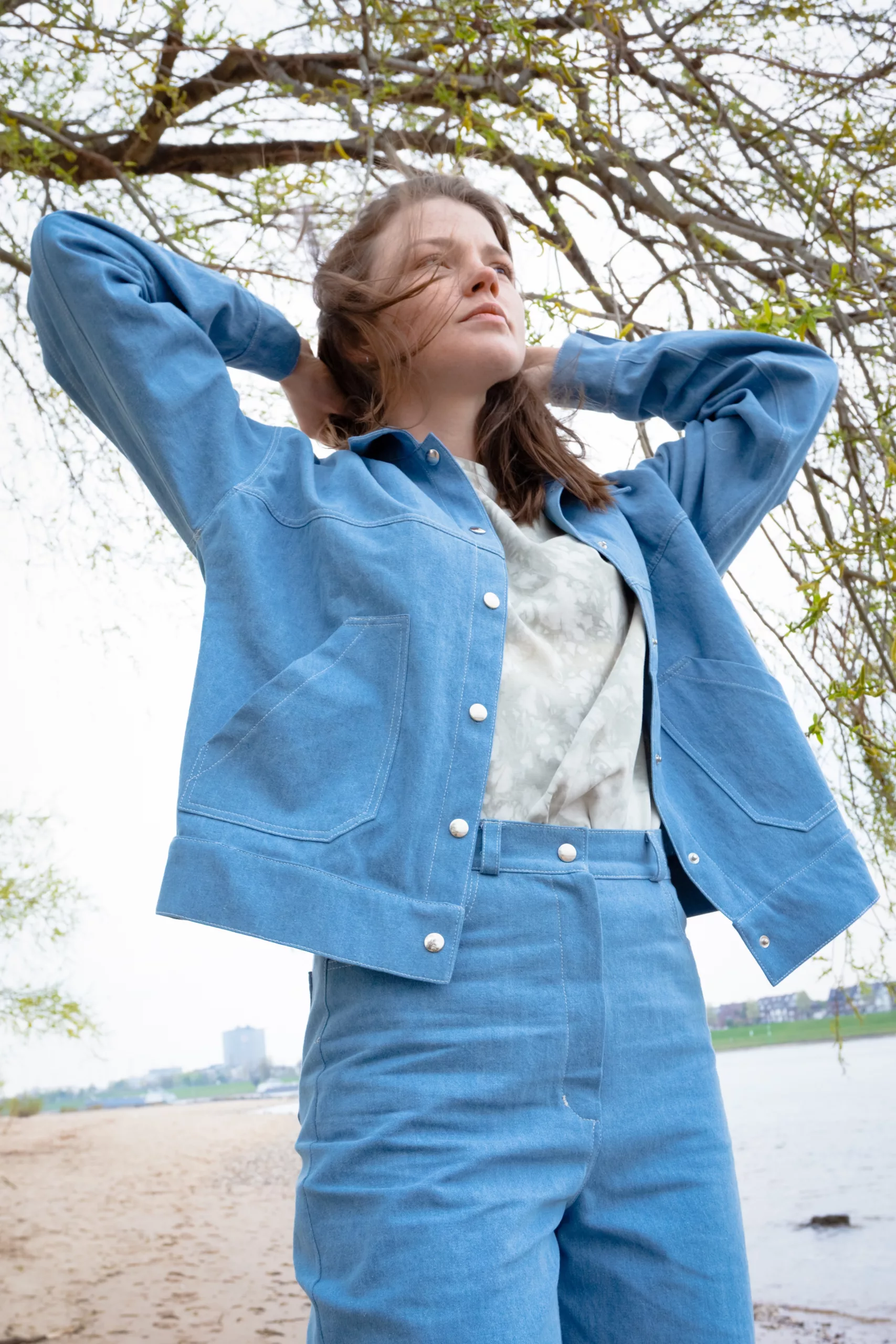 Die Oversize-Jeansjacke besteht aus 95% Bio-Baumwolle und 5% Elasthan. Sie wird mit Druckknöpfen geschlossen und bietet mit den großen Taschen genügend Platz für dein Handy.